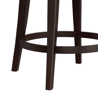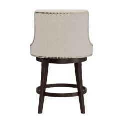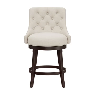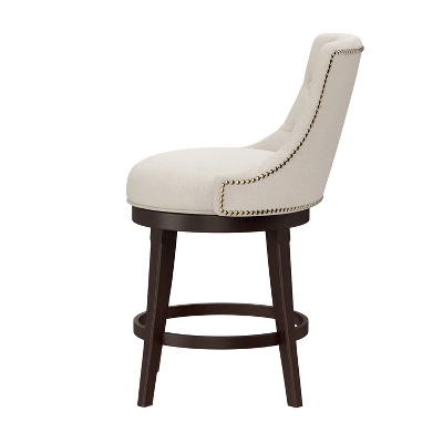 Is it a bar stool? Is it your favorite cozy chair? With this Wooden Counter Height Stool, you can have both! The sturdy chocolate wood base of this stool supports a beautifully designed 360-degree swivel chair in a subtle cream fabric that feels like it could live in any room of your home. And with its low English arm style, button tufted back, and shiny nickel nailhead trim along the edges, this traditional bar stool manages to offer a touch of modern flair and sophistication for any design scheme. So, go ahead—grab your tea, grab a book, and grab a seat. Assembly required.