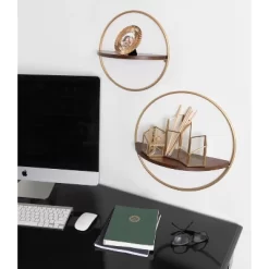 The Maxfield shelf set combines modern simplicity with practical functionality in its elegant, minimal design. Inspired by geometric forms, these shelves feature a round, simple metal frame, with a lovely half-moon wood shelf nestled within. This shelf set includes two different sizes: The larger of the two shelves is 15 inches wide with a 5.5-inch depth, while the smaller Maxfield wall shelf is 12 inches wide with a 4.5-inch depth. They look magnificent on the wall side by side, staggered, or in separate rooms for a cohesive decorative aesthetic. These modern round wall shelves look fantastic in any entryway, living room, office, bedroom, or bathroom. The 4.5 and 5.5-inch shelf depths make it easy to house your favorite keepsakes, succulents, and photos! Their one-of-a-kind look and outstanding functionality make for a stunning conversation piece for any room. Hang the Maxfield shelves on the wall in a matter of seconds with the convenient metal eyelet hangers attached to the back of the frame.