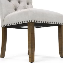 Create an elegant and inviting style with the beautiful, rustic pine and ivory fabric dining chair. Soft textured linen fabric wraps the beautiful tufted back rest as nailheads distinguish the seat’s border. Warm legs have distinguished weathered touches for a dash of rustic appeal and slightly taper to complete its timeless look. Foam-filled seats over sturdy bentwood, hardwood, and rubberwood frames create a comfortable seat with plenty of support.