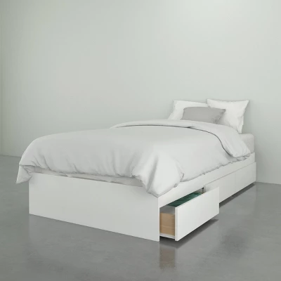 The Nexera 3 Drawer Storage Bed can be paired with different Nexera Headboards to create a complete bed set with lots of storage. This Storage Bed offers 3 convenient drawers, ideal to store away beddings, clothes, and books without taking any extra square footage. It’s also entirely reversible, so you can decide on which side of the bed you prefer having the 3 drawers. This bed frame features a unique metal and hardwood slat construction allowing for easy assembly, sturdy construction and easier handling.