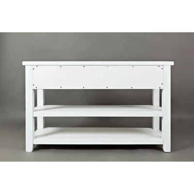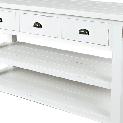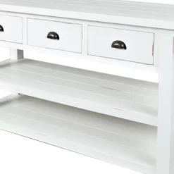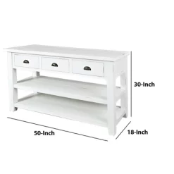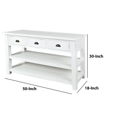This interactive multi-space sofa table combines fun and functional storage space for modern looking homes. Made up of wood, finishes in weathered white color, this sofa table features three drawers with cut-out handles, and two open shelves with flat top surface. This can be used to store all knick-knacks or to display decorative accents on it. The storage drawers and open beneath shelves can store a lot. This sofa table is not just a table, many more convenient adjustments you can make with this elegant furniture piece. Drawer Dimensions: 10.5″W x 13.25″D x 4″H. Shelf Dimensions: 47.25″W x 16.25″D x 7.5″H.