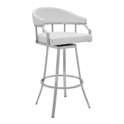 The Palmdale Swivel Modern Metal and Faux Leather Bar and Counter Height Stool is a fabulous and functional furniture addition to any home! This beautiful stool is upholstered in butter soft faux leather in multiple color options. The frame of the Palmdale stool is constructed from brushed stainless steel that is sturdy enough to last for many years to come. Enjoy full mobility with the 360-degree swivel functionality that allows you to join in on the conversation from any part of your kitchen or bar area. The padded and upholstered back rest gives you comfort that only increases with its convenient metal ring footrest. Enjoy a luxurious style bar or counter stool that is unique in style and practical in function. The Palmdale Swivel Modern Metal and Faux Leather Bar and Counter height stools are available in a sleek brushed stainless-steel finish and come in your choice of White, Slate Gray or Black faux leather.