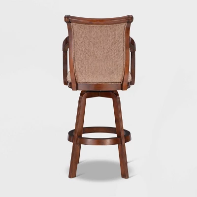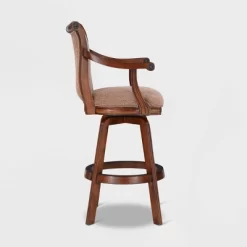 A barstool with a design that mixes a generous, spirited style with classic touches, this is a piece of furniture that can add elegance to about any room. The pretty classic cherry finish has a satin sheen bringing out the best of the solid rubberwood construction. Upholstery covering the seat is a traditional brown tweed that complements the wood stain. The sweeping open arm design provides comfort and support while the swivel base makes getting seated and following conversations easy.