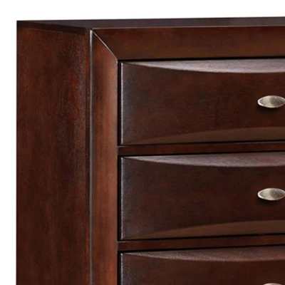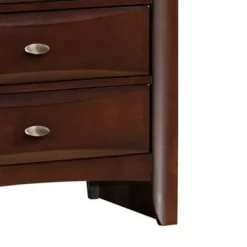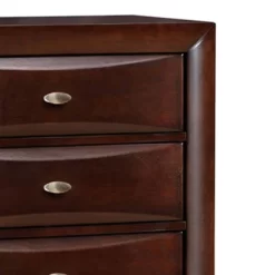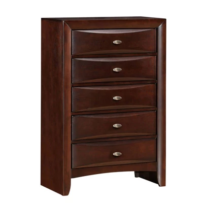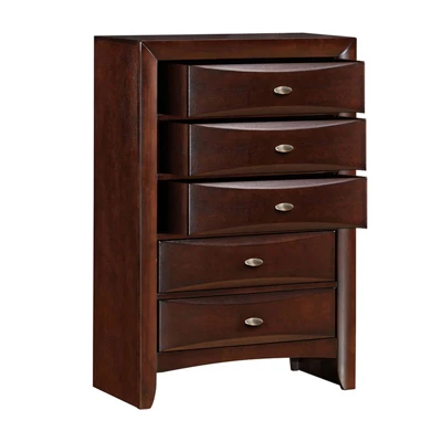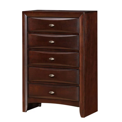 The Ireland chest in espresso with 5 drawers will meet all of your bedroom storage needs with space for clothing and linen. All drawers have English dovetail with center metal glides. Drawer fronts are beveled and complemented by slightly flared square square legs, the Ireland collection features contemporary feel and a modern espresso finish with shaped drawer fronts. This is the perfect bedroom set for your master or guest room.