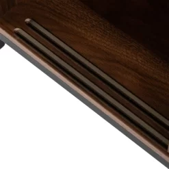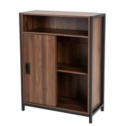 With walnut melamine board and matte black steel tube frame, this Floor Cabinet features open upper shelf compartment and double sliding door. Sliding door with built-in knob is both for space saving and easily open and close function, adjustable interior shelve is suitable for tall objects and meets your different needs for storing. X-shaped back offers both stability and aesthetic appeal. Both functional and versatile, it’s perfect as a book cabinet or used as an entry table for displaying your precious pieces or art for living rooms, bedrooms, kitchens or any rooms that needs extra storage space. Industrial style makes it suitable for all your other furniture. Steel tube frame guarantees the stability and 4 plastic caps on the bottom of tube can protect your floor from scratches.