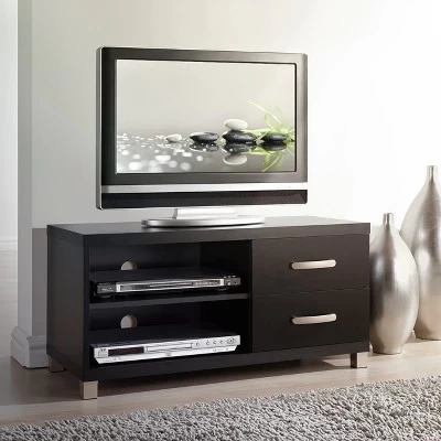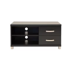 This modern Techni Mobili TV cabinet, for TVs up to 40″, is designed to fit any bedroom or family room. It includes two drawers and 2 shelves for storing electronics and gaming accessories. Shelves have a back panel with openings for cable management. The TV stand is made of heavy duty compressed wood and laminate surface that is resistant to scratches. Important: Holds TV’s up to 40″ when TV is measure diagonally. Actual unit is 35.6″ wide but TV overhang on either side is suitable. Color: Black