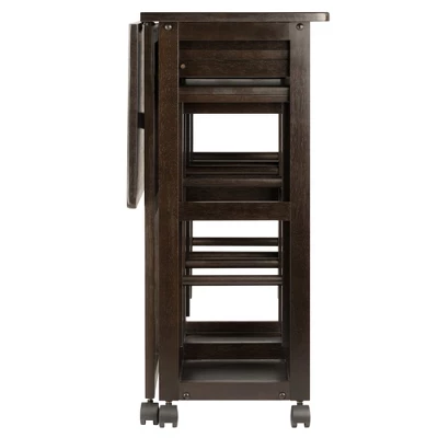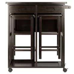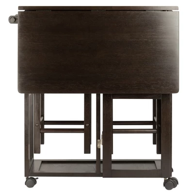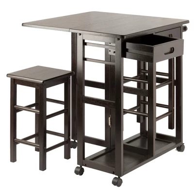 This inviting 3-Piece Space Saver Set will bring ease and versatility to dining in your kitchen, breakfast nook, or den. A drop leaf supported by a swing-away leg with a 5th rolling caster can be opened to create a dining table for two. Or lower the drop leaf, stow the stools, and roll the unit into the corner to create more open space. The sturdy hideaway stools have smooth, broad seat tops with rounded corners and can be tucked neatly under the table for a compact footprint. Two drawers with cut-out handles are ideal for silverware, napkins, and placemats. And the push handle also serves as handy place to hang a kitchen towel. Rolling casters, two of which lock to keep the unit stable while in use, allow for easily mobility. Made of solid and composite wood in a sleek Coffee finish.