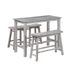 Rugged charm comes naturally to the Sonoma Dining Set. Add a saddle-style rustic vibe to your dining space. Whether you’re feeling sociable or need to fill your belly, this ensemble offers a comfortable place to gather. Available in three wire-brush finishes; barnwood, chestnut, storm gray. This set includes a pub table, bench, and two saddle-stools.