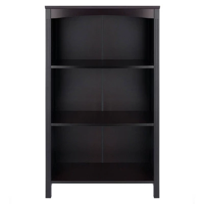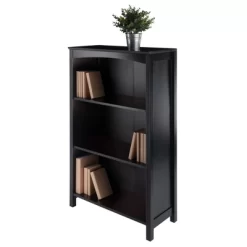 From hardbound volumes and decorative bins to family photo frames, the Terrace 3-Shelf Bookshelf from Winsome brings a functional and stylish update to your interiors. Featuring three spacious shelves to tuck away your journals, novels, decorative figurines or family photographs, this three-tier bookshelf makes a functional and stylish piece for smaller spaces. Decorated with a classic espresso finish with slightly arched details under the tabletop, this vertical bookcase brings a traditional flair to your space. This 4-Tier Shelf has overall size of 26″W x 11.8″W x 43″H. Top is 26″W x 11.81″D. Top shelf is 23.54″W x 10.63″D x 12.80″H and the other shelves are 12.32″H.