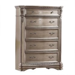 The Northville Collection 26939 42″ Chest with traditional design is distinguished by flowing lines and decorative details. It features curved fronts and tops, acanthus leaf accents, elaborately carved bracket feet and ornate pulls. The translucent finish accentuates the graining of its rubber wood solids and oak veneer construction. It includes 5 drawer, silver gray metal hardware molding and heavily detailed feet.