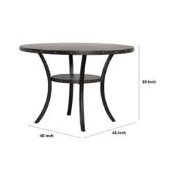 A bold statement for class and comfort, this 36 inch bar table features a smooth, black, rounded wood top and an open bottom shelf for simple and classically integrated storage. Rivets accent the glossy, smooth exterior and flared legs with a strong, industrial accent. Chairs sold separately. It is accented with metallic rivets.