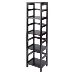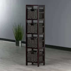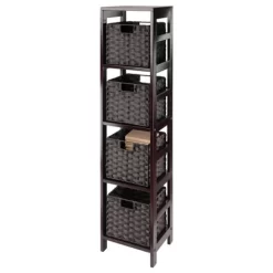 Combine extra storage space with the convenience of the versatile Winsome Wood Leo 5-Piece Storage Shelf set. Great narrow shelf that includes 4 foldable baskets for added organization. Simple yet sophisticated design is a perfect addition to use as a standalone bookcase in the family or living room. Keep seasonal accessories handy in the closet or use as a standalone bookcase in the family or living room. Finished in a rich espresso and made of solid wood for long-lasting durability. The set of baskets are woven in durable flat polypropylene in a chocolate finish and have two cut out handles, one on each end, for carrying purposes. Prompt up and these baskets measure 10.24”W x 11.02”D bringing charm and style. When not in use, they fold for easy storage taking up almost no space. So, whether you need it in the mud room for shoes, laundry room for the towels and detergents, or for your books in your home office, this 4-tier shelf offers stylish organization for all your essentials. This set is shipped in three boxes. The shelf will ship separately and will include the hardware necessary for assembly.