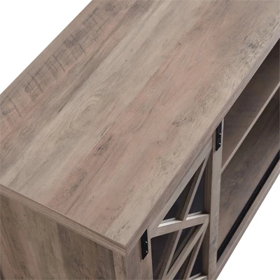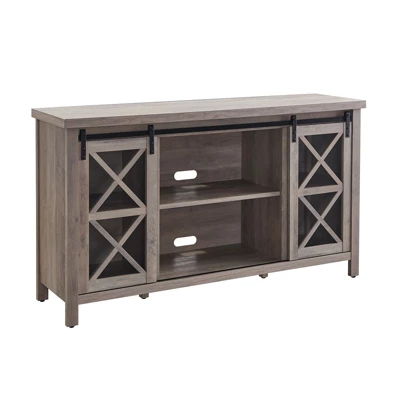 Combine functionality and on-trend design with this sturdy TV stand. Its rich wood tone creates a warm neutral palette that will blend seamlessly into any color scheme, while its functional sliding barn doors add a touch of modern farmhouse whimsy. A must-have for living areas and entertainment spaces, this TV stand sets the stage for the big game, a movie marathon, or that season finale everyone’s been talking about.Features : Finished in gray oak with black metal accents.The top has a weight capacity of 75 lbs. Lower shelves can hold 25 lbs. each.The two lower shelves feature an open center compartment and two side cabinets with sliding barn doors.Accommodates most flat-screen TVs up to 58 inches. Made from premium metal and tempered glass this media console can support up to 75 LBS.Premium materials have been used in the making of this productSpecifications : Product Weight : 94.7 lbsFrame Material : Wood