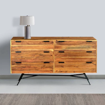 Give a quick makeover to your interior by bringing in this industrial style inspired Sideboard. Incorporated with 6 smooth gliding drawers to keep your kitchen essentials organized, the aesthetically pleasing grain details impart a riveting flair to it. Constructed sturdily from acacia wood frame for lasting durability, it is supported on angled metal legs with a reinforced trestle style base. The charming concoction of brown finish and striking black legs grant it an irresistible look and never fails to astonish an onlooker. The spacious storage allows you to keep your interior clutter free, while the wide top gives you plenty of room to flaunt vases, showpieces, valuable collectibles, and prized possessions.