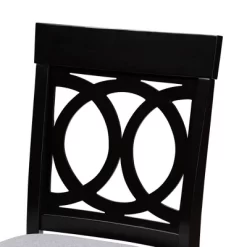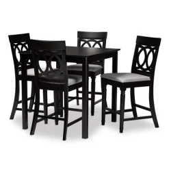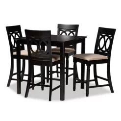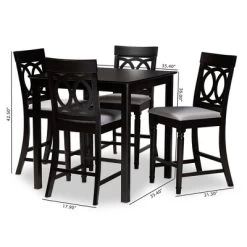 Elegant yet comfortable, the Verina 5pc pub set is a timeless addition to any space. Constructed from solid oak wood in an espresso finish, this pub set includes one table and four stools, each upholstered in a light polyester fabric that complements the dark wood finish. Padded with foam for the utmost comfort as you enjoy long dinners, each stool features a striking cut-out design on its back for enhanced visual appeal. Comfortable and stylish, the Verina set is sure to elevate any dining experience. The Verina 5pc pub set is made in Malaysia and requires assembly.