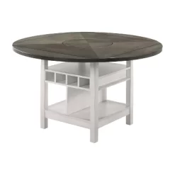 A charming farmhouse aesthetic delivers smashing charm to a casual kitchen or dining room when the Summerland round dining table arrives, offering utility as well as visually captivating looks. Solid wood and wood veneer construction in your choice of finish options embellishes a table unit with a round top and drop-leaves to make it square. A tabletop Lazy Susan offers convenient access, and a base with open shelving, wine slots, and an open center shelf ensure you have everything you need for a full meal or informal happy hour.