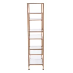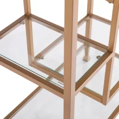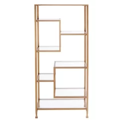 Everything has its place with the Aiden Lane Jamel Metal/Glass Asymmetrical Etagere/Bookcase. The asymmetrical silhouette creates a geometric look in your home, all while displaying your treasures, sentimental knickknacks, or book collection. Glass shelves craft and an open frame give your décor an airy, floating feel, while the small footprint slides easily into tight spaces. Add this multi-tiered bookshelf to your living room and put your style on display, or place in your home office to keep clutter at bay.