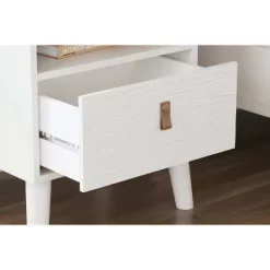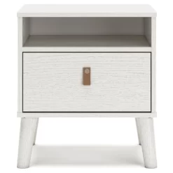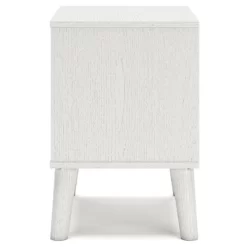 Dare to take minimalism to the max. This nightstand has an air of sleek simplicity thanks to its white painted finish with subtle replicated wood grain. Magnificently mod splay legs are a compelling complement to the streamlined design. And with two different faux leather drawer pulls that allow you to customize the nightstand to suit your space, there’s no doubt about it: This contemporary piece is sure to become a classic. A nightstand, or bedside table, is an essential component in every bedroom. Whether you’re looking for a white nightstand, black nightstand or even a mirrored nightstand, Ashley has what you need to create the bedroom of your dreams. Signature Design by Ashley is a registered trademark of Ashley Furniture Industries, Inc..