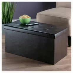 Enhance your living space with this Ashford Faux-Leather Ottoman from Winsome. Crafted from soft faux-leather upholstery wrapped firmly around a rectangular frame, this warm, espresso-brown ottoman adds chic appeal to your interiors. Complete with a well-cushioned top and a hidden storage compartment for throws and blankets, this button-tufted faux-leather ottoman makes a welcome addition to your space. The ottoman features sturdy construction with MDF inside both top and base. The base folds for easy storage. As a seat, it will hold up to 150 lbs. The top is cushioned faux leather for maximum comfort. Instant assembly.