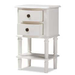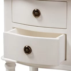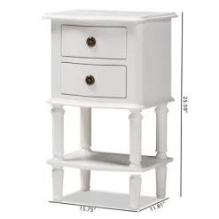 The Audrey 2-drawer nightstand has the clean, crisp look you’ve been searching for. The country cottage farmhouse-inspired design emphasizes smooth lines and bucolic details. The Audrey’s sturdy frame is finished all over in white, mathis piece dynamic and easy to coordinate with a wide range of looks, including French and rustic styles. The nightstand features two convenient drawers for additional storage at your bedside, as well as an open shelf space. The drawer knobs of the Audrey have a charming design, and are finished in bronze. The gently curved face of the nightstand complements the carved, contoured look of the piece’s top and ball-turned legs. Breathe new life into your bedroom or guest room with the Audrey nightstand. Made in Indonesia, the nightstand requires assembly. Dimensions: 25.59″ High x 15.75″ Wide x 11.81″ Deep; Drawers: 4.33″ High x 9.84″ Wide x 9.25″ Deep; Shelf: 10.94″ High x 14.57″ Wide x 10.43″ Deep: Legs: 4.96″ High