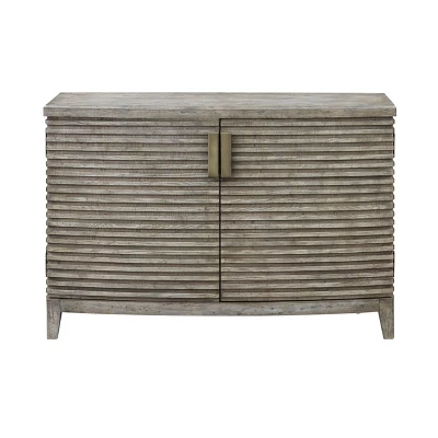 A corrugated horizontal pattern wraps around the sides and across the curved fronts of the two doors for an intriguing textural design that draws the eye, making this Credenza a dramatic focal point for any room. Finished in our Frisco Earl Grey Rub with custom oversized hardware and a spacious shelved interior, you will love not only the storage space, but also the sculptural touch this Credenza will add to your decor.