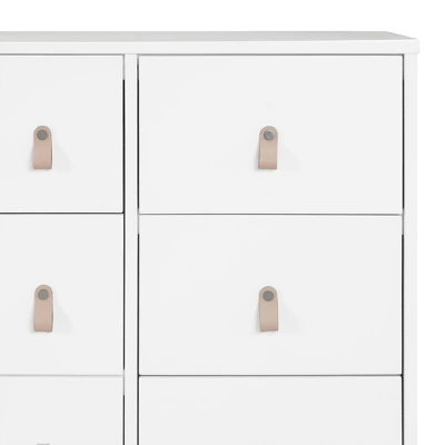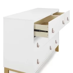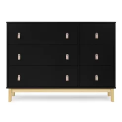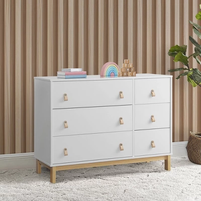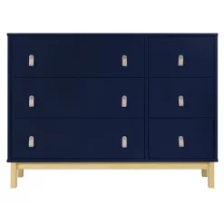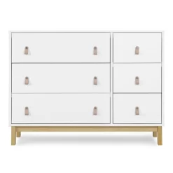 The babyGap by Delta Children Legacy 6 Drawer Dresser with Leather Pulls and Interlocking Drawers is a spacious and stylish storage option. A great addition to any nursery or kids’ bedroom, the leather drawer pulls add a fun detail to the piece. Crafted of sturdy, sustainable materials like New Zealand pine to give it plenty of longevity, this versatile dresser has a mix of small and large drawers to simplify organization. For your child’s safety, this dresser is outfitted with an interlocking drawer system that limits the number of drawers that can be opened at one time. Available in Bianca White/Natural, Navy/Natural and Ebony/Natural. Easily mix, match, and layer with other items from the babyGap Furniture and Bedding Collection. Pair with the coordinating Changing Top #W173810 to convert the dresser into a convenient changing table (Changing Top and changing pad sold separately).