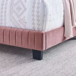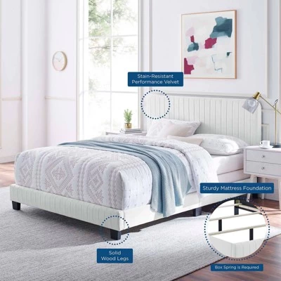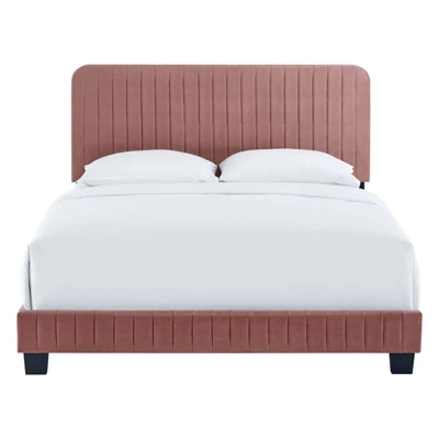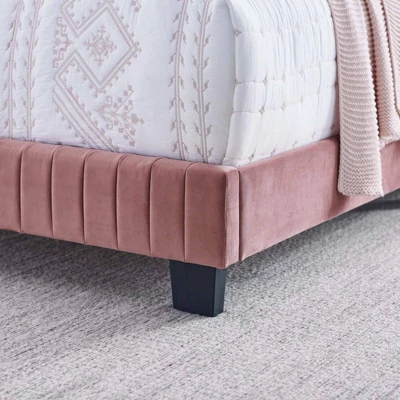 Elevate your master bedroom or guest bedroom style with the luxe texture and glam deco elegance of the Celine King Bed. Adorned with channel tufted detail, the king size headboard of this upholstered bed is padded in dense foam to offer supportive comfort while sitting up resting, relaxing, reading, or watching TV. Upholstered in stain-resistant performance velvet, this king size bed features support legs for added durability. A sturdy mattress foundation, this king size bed accommodates a variety of mattress styles including innerspring, memory foam, and latex with the use of a box spring. Assembly required. Weight Limit: 900 lbs.