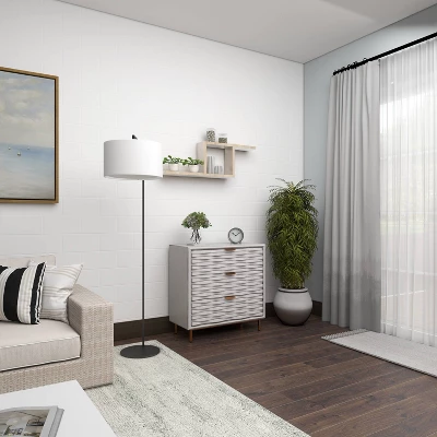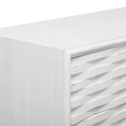 - •Rectangle storage dresser features 3 drawers with textured geometric patterns and bar handles, open under clearance space and smooth surface top