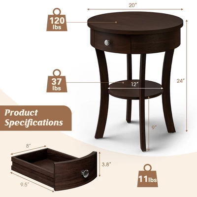 Are you looking for a coffee table that fits the space next to your sofa? This two-tier, round side table is a great choice for you! Its compact size allows it to provide you with practical value without taking up too much space. It has a round table top and one open shelf for you to place your coffee cups or magazines. In addition, this side table has a drawer with a handle for storing personal items. It can be used not only as a side table, but also as a double accent table to be placed at your home. The charming and retro classic appearance will add highlight to your room.
