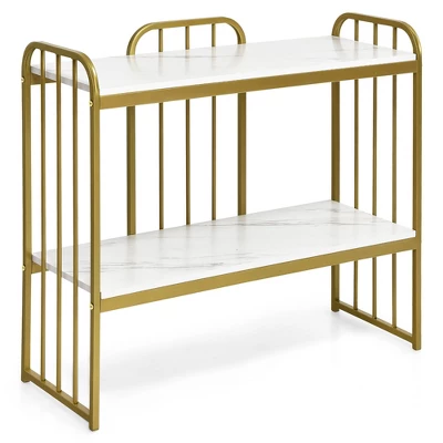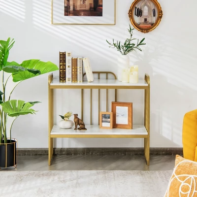 The console table with stunning minimalist design is a great complement to your living space that once again highlights your taste. The elegant marble-like surface and glossy golden frame are combined to create a luxurious and stylish appearance. Equipped with 2 open shelves, it is a good console to be placed beside the couch or along the hallway, displaying your loved ornaments, photos and flowers. What’s more, the sofa table is made of high-quality MDF and thickened steel pipes, so that is rather durable and sturdy.And with non-scratch gaskets, you don’t have to worry about that the metal feet would damage your floor. Don’t hesitate to add it to your cart!