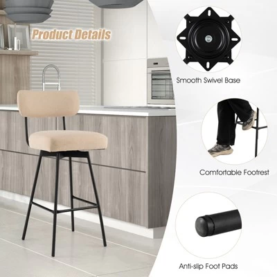 These swivel bar stools feature a modern and simple style, making them suitable for various occasions, such as the kitchen island, dining room, home bar, etc. The upholstered seat is soft-to-touch and comfortable. And the curved backrest and comfortable footrests offer support to your back and feet. While sitting on the chairs, the metal legs provide strong support and stability. With the swivel design, these modern dining chairs give you maximum mobility to rotate in any direction. When you move the stools, the foot pads can prevent scratching the floor. These modern swivel bar stools are ideal additions to your home that create a cozy sitting area.