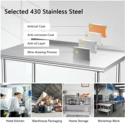 - Premium Stainless Steel Material: The tabletop of this work table is made of high quality stainless steel, which has outstanding performance in wear resistance, rust protection and won’t deform easily. So you can directly cut vegetables and other food on this stainless steel work table and clean it easily with a wet towel after use.