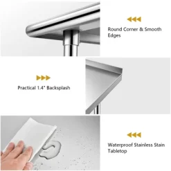 - Practical Backsplash & Round Corner: This stainless steel work table comes with a 1.4” backsplash, which can effectively prevent your items from falling off the table. What’s more, thanks to the exquisite workmanship, the table boasts round corner and smooth edges to protect you from collisions or scratches during daily work.