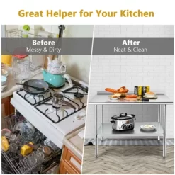 This stainless steel work table will be a great helper for your kitchen! Made of selected 430 stainless steel which has strong rust resistance and high toughness, this work table can withstand years of frequent use. Featuring a spacious tabletop and an adjustable under shelf, our prep table provides ample room for both operation and storage, which can utilize your limited living space. The practical backsplash can protect your items from falling off the work table. Smooth table edges and round corner design create a safe workspace for you. This stainless steel table can not only be used as a kitchen prep table, but also can be settled in the garage, workshop, laundry room, warehouse, garden or any other working area.