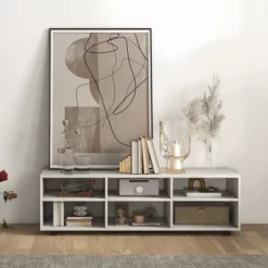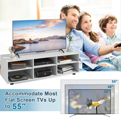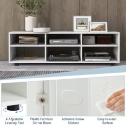 - Spacious Open Storage Space: The TV console table is designed with 6-cubby compartments with classified storage space and keep television, video player, books, CDs, vase, decorations organized. The upper wide tabletop is roomy enough to accommodate most flat screen TVs up to 55”. The open design is perfect for showcasing and easy fetching.