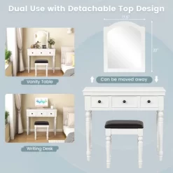 Costway Vanity Table Set Makeup Desk Cushioned Stool 3 Drawer Large Mirror White/Walnut