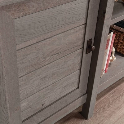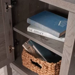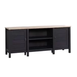 A functional and stylish piece, this TV stand Accommodates up to a 65″ TV weighing 70 lbs. or less. Great hidden storage behind doors for books, DVDs, and more and three adjustable shelves for varied storage options.