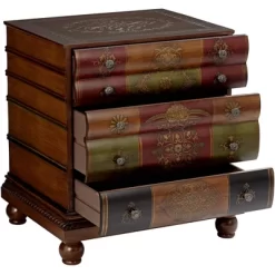 Classic and playful, this fancy traditional 3-drawer end table is deceiving. With a hand-painted chestnut finish with golden accents with embossed book details , this table has a bold design that is sure to stand out wherever it goes.