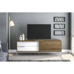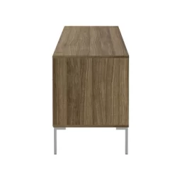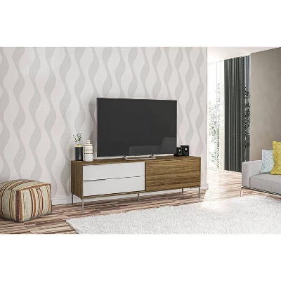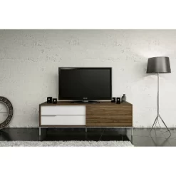The Denver TV stand is a perfect addition to any living room. It will bring a modern look to your home while keeping all your media components organized. This TV stand features a light brown and white color combination with brushed aluminum handles and legs. This is one of the best items you can have for your living room.