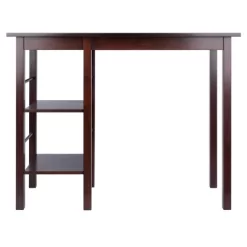 The Walnut Dining Table from Winsome is a versatile and functional addition to your space. The wooden dining table stands tall for easy conversation and features a smooth rectangular tabletop supported by a sturdy walnut frame. It features two open shelves below on one side to keep stemware, drinkware, wine bottles and more at the ready. Completed with six sturdy, square legs, this table can easily accommodate up to four people. The Egan Collection Breakfast Table with Two Side Shelves utilizes its 36.16″H x 44.88″W x 19.69″D stature by including two vertically aligned platforms, the upper with 11.61″W x 15.75″D x 12.2″H of additional space, and the lower with 11.61″W x 15.75″D x 12″H.