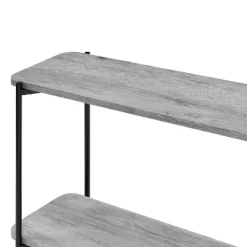 This charming 2-tone transitional style console table features a combination of materials and hues that give any living space a warm, inviting allure. The 2-shelves come in a light gray finish with wood grain details for a rustic touch, complemented by a sleek metal frame and legs in a sand black finish. The rounded edges of each shelf give this delightful table a sense of refinement and sophistication.