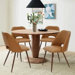 From The Pop Maison’s 19″ seat width is wider than many dining chairs in market! It provides outstanding comfort with its FOAM-PADDED wide seat while the rest of the seat is wrapped in faux leather upholstery for a vintage-inspired look and supportive back. The spray look leg is made of Solid Metal which blend a sculpture design in your dining room.The faux leather, besides the cool black, we find the modern TAN color! Not old or vintage brown, that is kind of warm warm caramel but very young and chic.The DISTRESSED effect on fabric makes it not easy to get dirty and BREEZE TO MAINTAIN, it is super EASY TO VACUUM.All the colors are custom-made.
