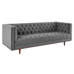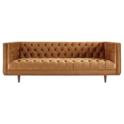 Inspire vintage modernity and glam deco style in your living space with the Elation Tufted Performance Velvet Sofa. Adorned with beautiful button tufting in an elegant diamond pattern, this living room sofa adds effortless depth to any lounge area. Elation is covered in stain-resistant performance velvet upholstery and features dense foam padding for a premium seating experience. With a durably crafted wood frame, this sofa rests atop tapered rubberwood legs. Includes non-marking foot caps. Assembly required. Sofa Weight Capacity: 881 lbs.