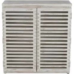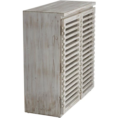 With its wood wash finish and slat doors, this handsome design offers both style and function. It features slat doors that are ideal for use in a modern farmhouse or coastal style room. The doors open to reveal a generous storage area inside. Use in a living room for extra storage, or place in a dining room or hallway.