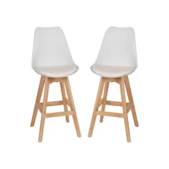 Add contemporary style to your dining room or kitchen with this set of two bar height dining stools. Comfortable and stylish, the rounded high back design features soft and durable plastic upholstery in white and a matching attached faux leather seat cushion for added comfort. A durable wooden frame and solid wood legs in an attractive oak finish add strength and stability with a 300 lbs. static weight capacity. Sturdy cross bracing serves double duty as an integrated footrest offering leg support for added comfort. The legs are fitted with felt pads to ensure smooth movement and protect hard flooring surfaces from damage. Each stool assembles in 30 minutes or less with the included, step-by-step instructions. For easy cleaning, simply wipe away dust and debris with a dry cloth.