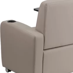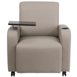 Welcome your visitors and colleagues with this gray LeatherSoft guest chair with tablet arm. The chair has a plush seat with foam padding and features a tablet arm for working on a laptop or completing paperwork. The tablet arm swings a full 360 degrees to position it at the ideal angle. A built-in cup holder keeps hands free for writing or typing while minimizing the possibility for spills. Easily move this chair by lifting up the back and rolling it on the two front wheel swivel casters. Sturdy, rear chrome legs are capped with plastic floor glides to protect your floor by sliding smoothly when you move it. Whether you’re creating a dedicated study space for a college or library or a productive space for visitors to wait, this attractive chair is an excellent choice. Additional Features: Plush Seat with CAL 117 Fire Retardant Foam, Taut Back and Seat, Front Wheel Casters, Rear Chrome Feet with Floor Protector Plastic Glides, Tablet Size: 13.75″W x 10″D x 7.5″H from seat; 18.25″H from floor , Tablet is 1.25″H from arm, LeatherSoft is leather and polyurethane for added softness and durability