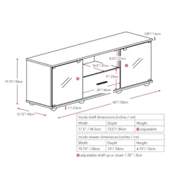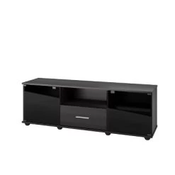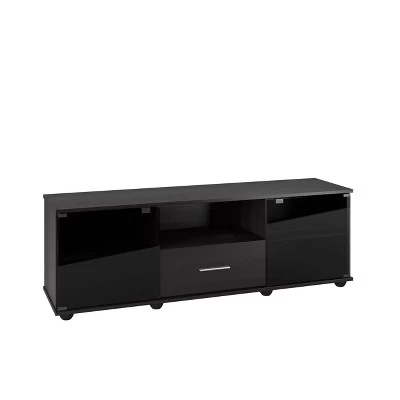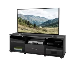 Upgrade your home theater with the TV media stand from the Fernbrook Collection. The wide surface is practical for a mounted or sitting TV. Available in our black faux wood grain finish and accented with metal aluminum handle pull. This bench is a beautiful combination of open and concealed storage space and is built to accommodate most TVs up to 75 inches, a great addition to any living room or entertainment space