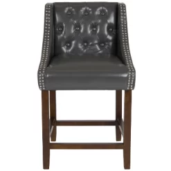 If you’re looking to add some wow factor to your kitchen, pool table room or basement’s entertainment space, this delightful dining stool will add much presence. When guests come into your kitchen, they’ll immediately want to take a seat at the island atop this counter height stool with tufted back. This classically sophisticated upholstered counter stool with decorative nail trimming lend a touch of old-world elegance and comfort. You are immediately drawn to the button tufting on the back and double nail trimming along the arms. A dark walnut frame contrasts the upholstery, while offering a proper resting place for your feet. Enjoy the comforts of this kitchen stool anywhere around the home with its full back and deep seat, providing an open invitation to lounge, eat, drink and be merry. Additional Features: Footrest provides better sitting experience, Wood Frame Finish, Floor Protector Glides, LeatherSoft is leather and polyurethane for added Softness and Durability, Designed for Residential Use Only