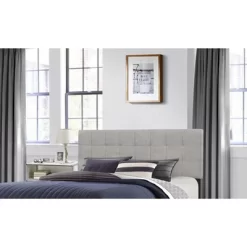 The Hillsdale Furniture Delaney Upholstered Full Bed is classic and minimal. The square low-profile headboard features biscuit tufting that boasts exquisite stitching complimented by low profile sides and footboard. The Glacier Gray upholstery is perfectly complimented by dark wood legs. Includes headboard, side rails, and footboard; Box spring and mattress required; not included. Assembly required.
