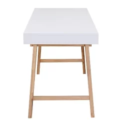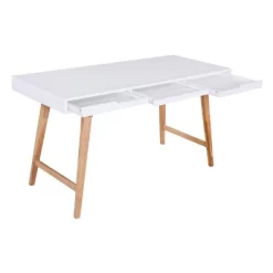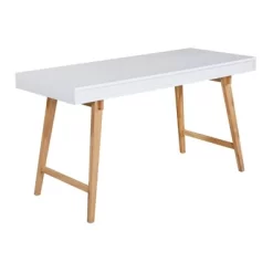 - The modern white desktop gently contrasts with the tapered, pale wooden legs for a distinctly Parisian design.